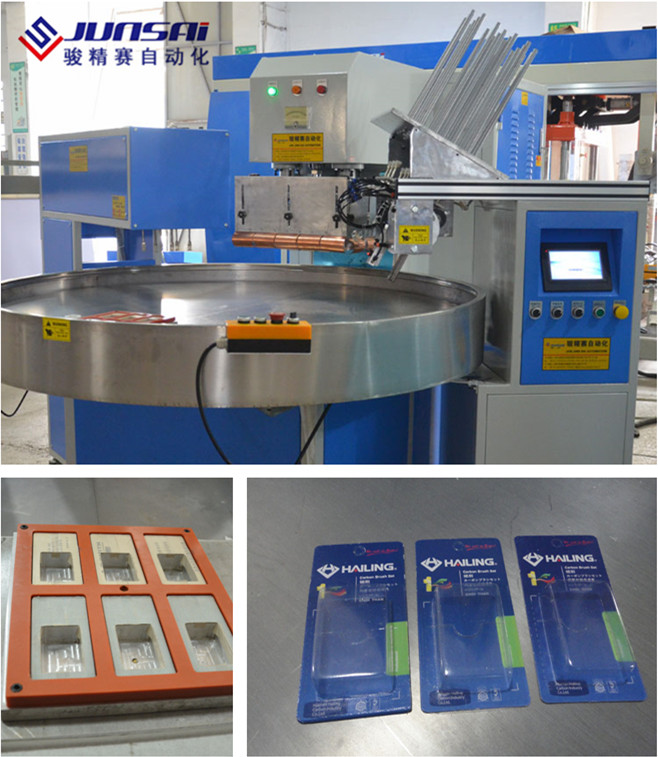 2. 用于吸塑包裝封口的高周波機器,使用時可根據吸塑包裝的產品尺寸大小,來決定一次同時包裝一個或多個產品。工作臺自動旋轉,3-6工位可選擇,工作效率更高。